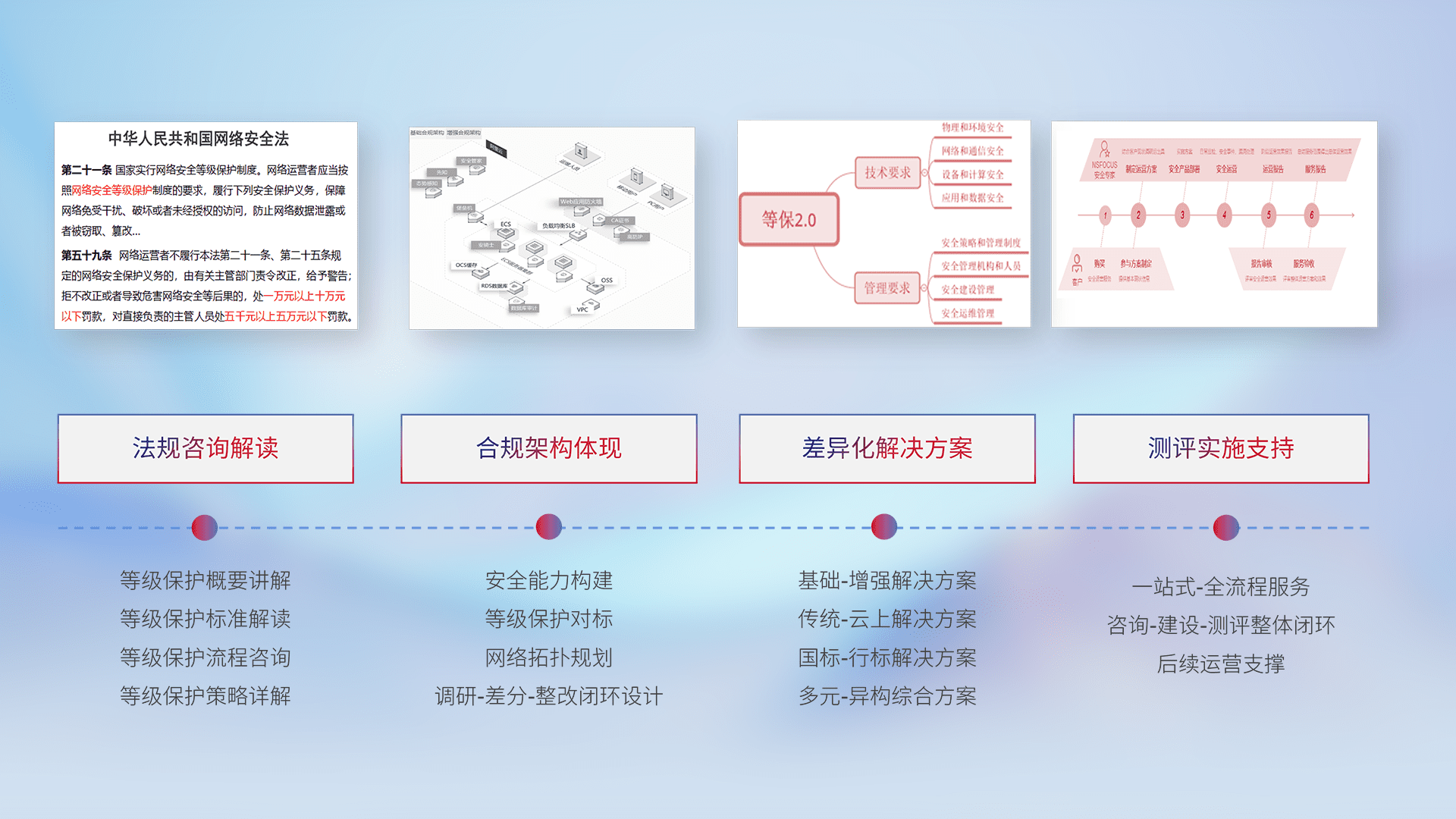 通过专业的法律咨询解读、、、合规架构体现、、、差异化解决方案、、测试实施支持等服务,,,,为客户量身打造等保合规体系。。。